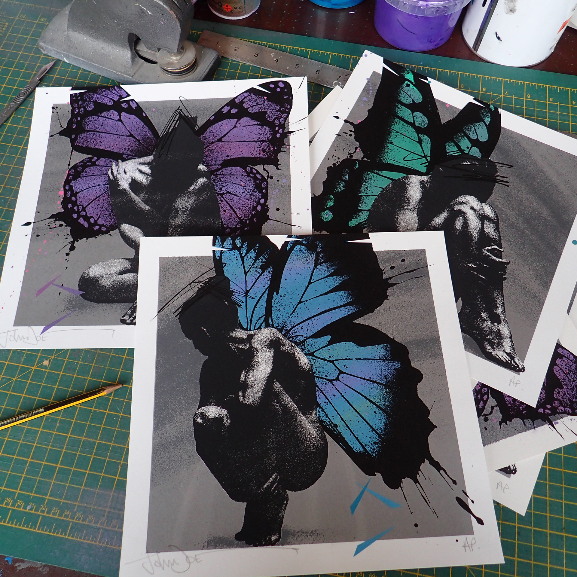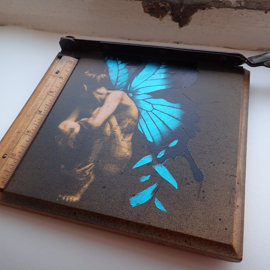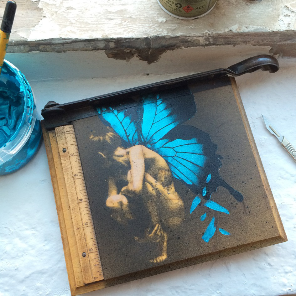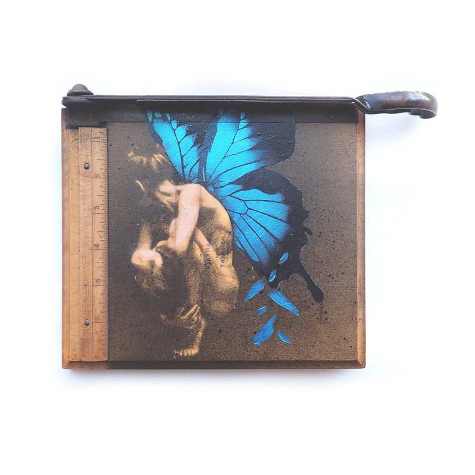 spraypaint and iridescent acrylic on vintage guilotine (7.5 x 8.5 inch) can be